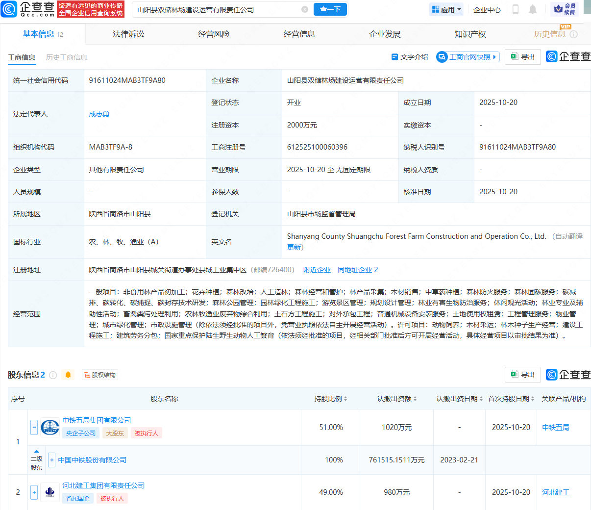 近日,山阳县双储林场建设运营有限责任公司成立,法定代表人为成志勇,注册资本为2000万元,经营范围包含:花卉种植;森林改培;人工造林;森林经营和管护;林产品采集;木材销售;中草药种植等。企查查股权穿透显示雅休配资,该公司由中国中铁(601390)全资子公司中铁五局集团有限公司、河北建工集团有限责任公司共同持股。